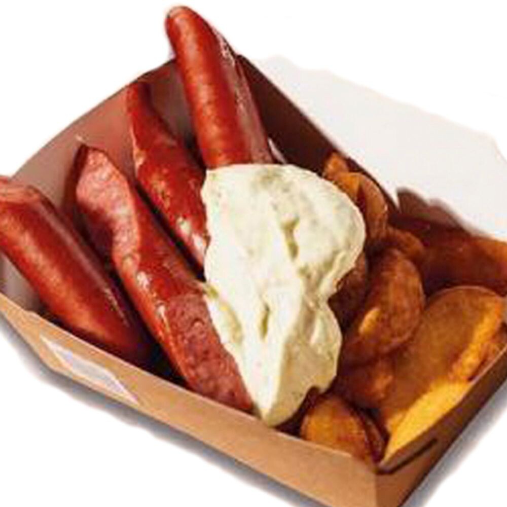 Картофельные дольки, охотничьи колбаски, соус сливочно-чесночный