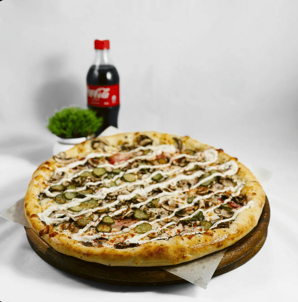 Пицца «Деревенская». Соус «Ранч», грудинка, сыр «Моцарелла», красный лук, огурец маринованный, шампиньоны, базилик