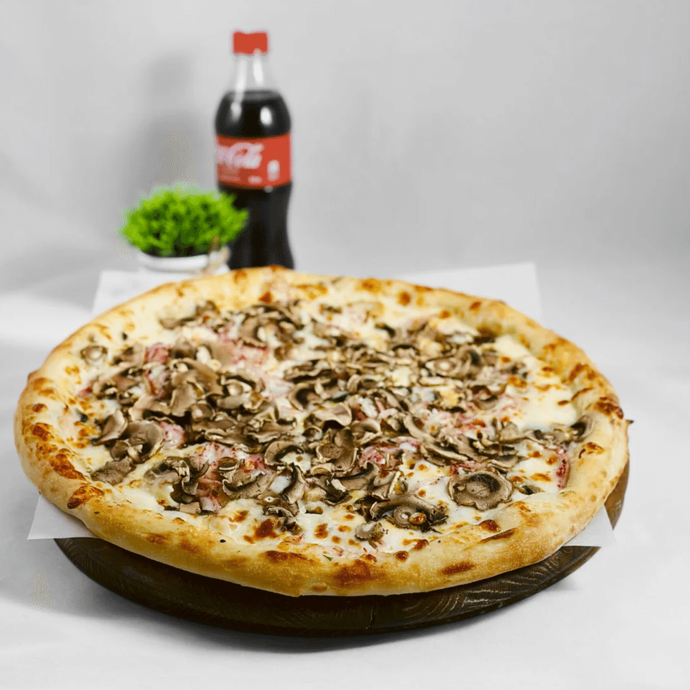 Пицца «Жюльен». Соус «Трюфельный», филе цыплёнка, сыр «Моцарелла», шампиньоны, базилик, лук маринованный, сыр «Пармезан»