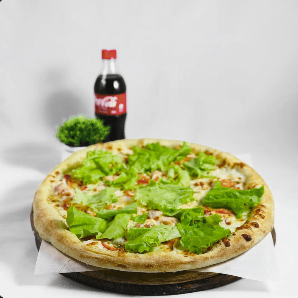 Пицца «Цезарь». Филе цыплёнка, помидоры, сливки, сыр «Моцарелла», сыр «Пармезан», листья салата, соус «Цезарь», базилик