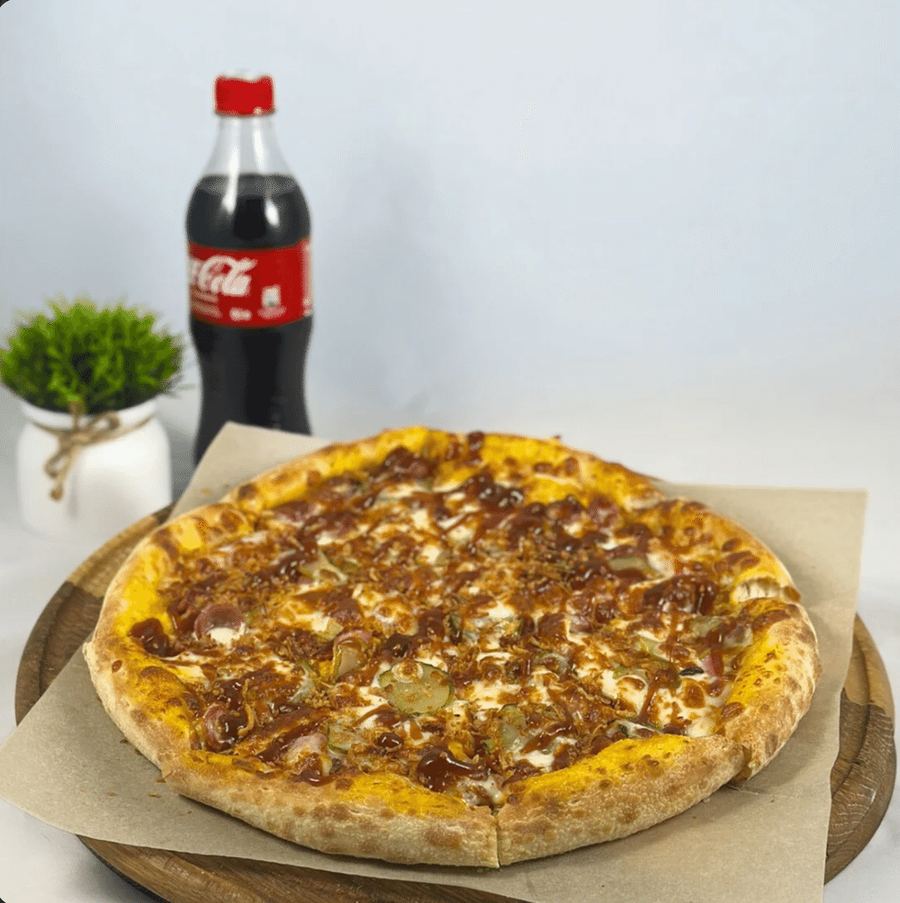 Пицца «Охотничья». Соус «Горчичный», грудинка, колбаски охотничьи, луковые чипсы, сыр «Моцарелла», базилик, огурцы консервированные, соус «Барбекю»