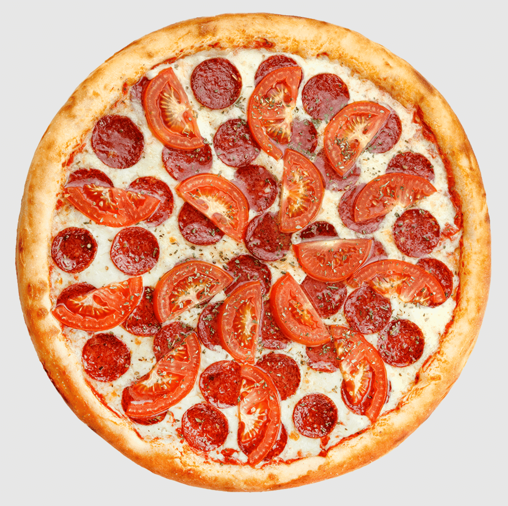 Пицца «Пепперони с томатами». Пицца соус, пепперони, томаты, сыр «Моцарелла», базилик