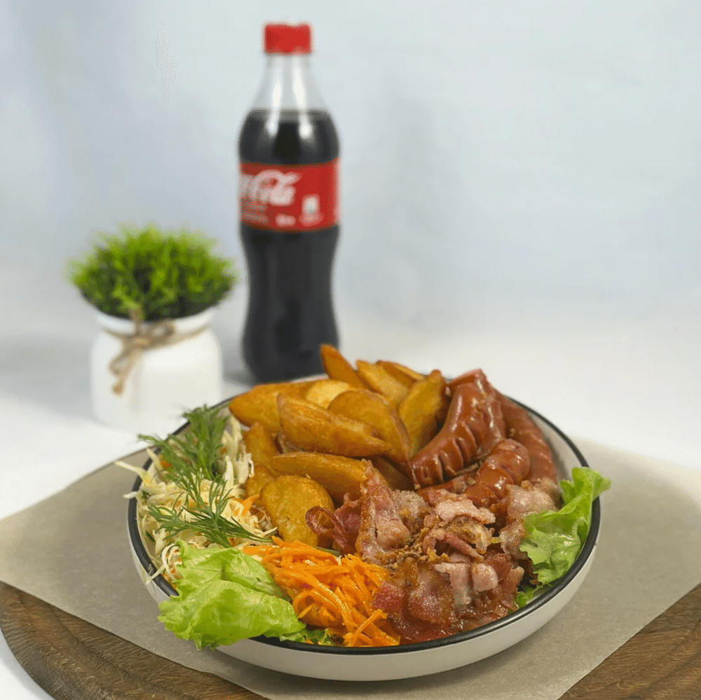 Колбаска охотничья, бекон, салат, морковь «По-корейски», картофель фри или картофельные дольки на выбор, соус «Ранч»