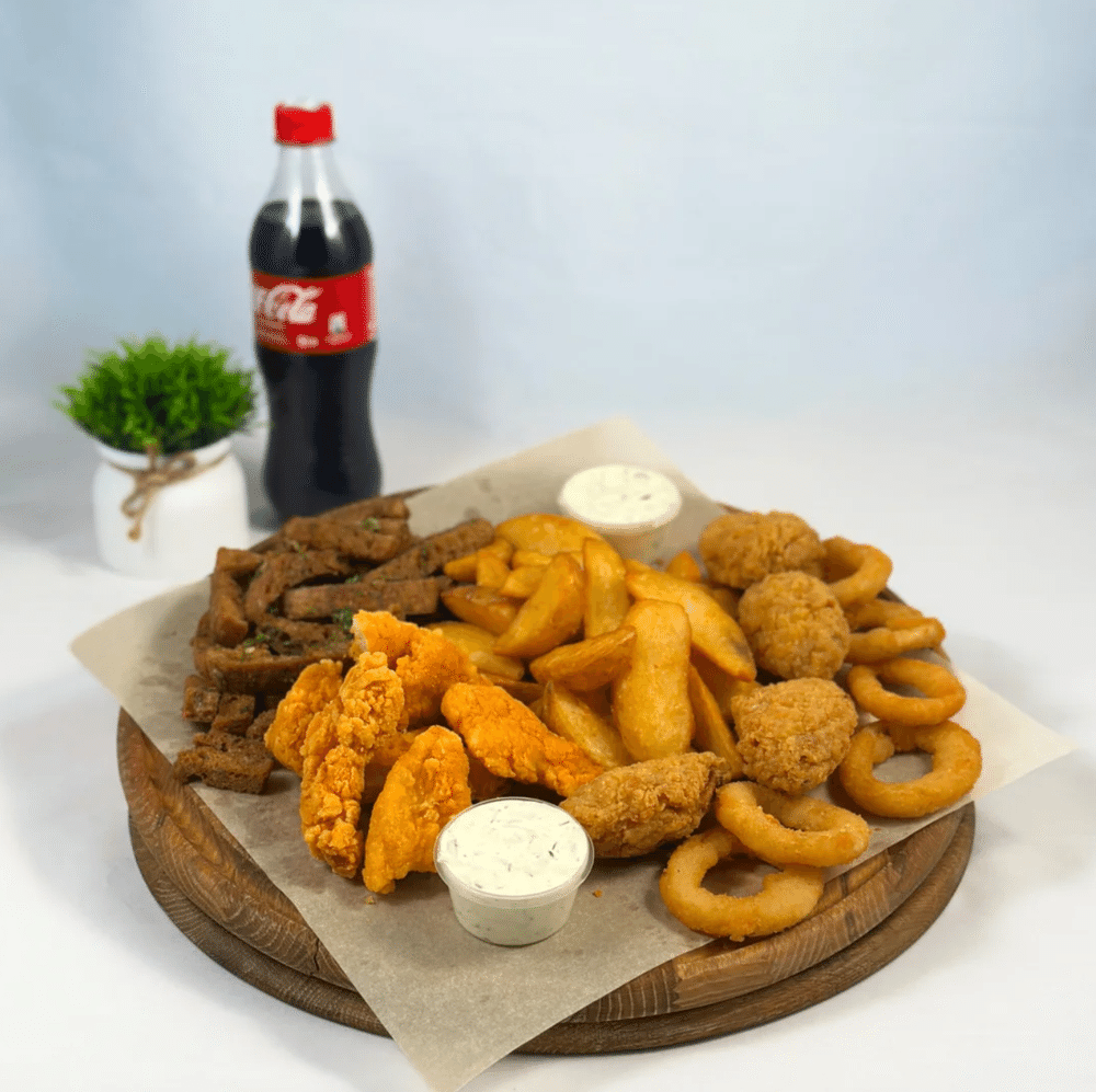 С трипсы куриные, крылышки в панировке, картофель по-деревенски, луковые кольца, гренки, соус тартар