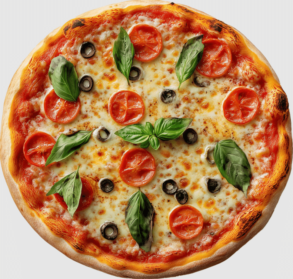 Пицца «Итальянская». Пицца соус, грудинка, салями, шампиньоны, сыр «Моцарелла», маслины, базилик